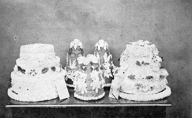 Five decorated cakes.