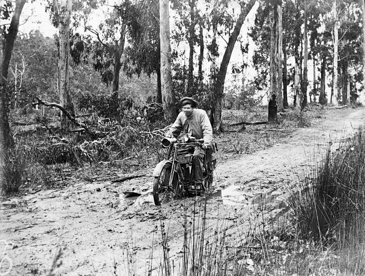A motorcyclist riding his bike along a very muddy track in the bush.