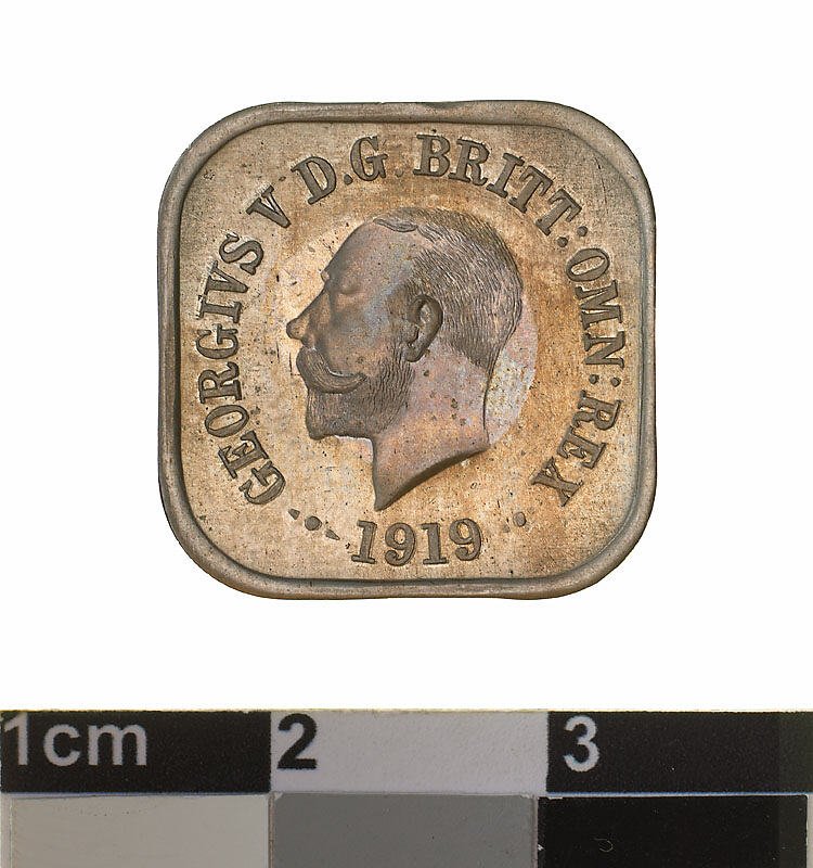 Between 1919 and 1921 a series of experiments were undertaken for a square coinage in nickel to replace the large bronze penny and halfpenny coins. The shape and size was based of a coin from Ceylon (Sri Lanka). These patterns were never authorised for issue.