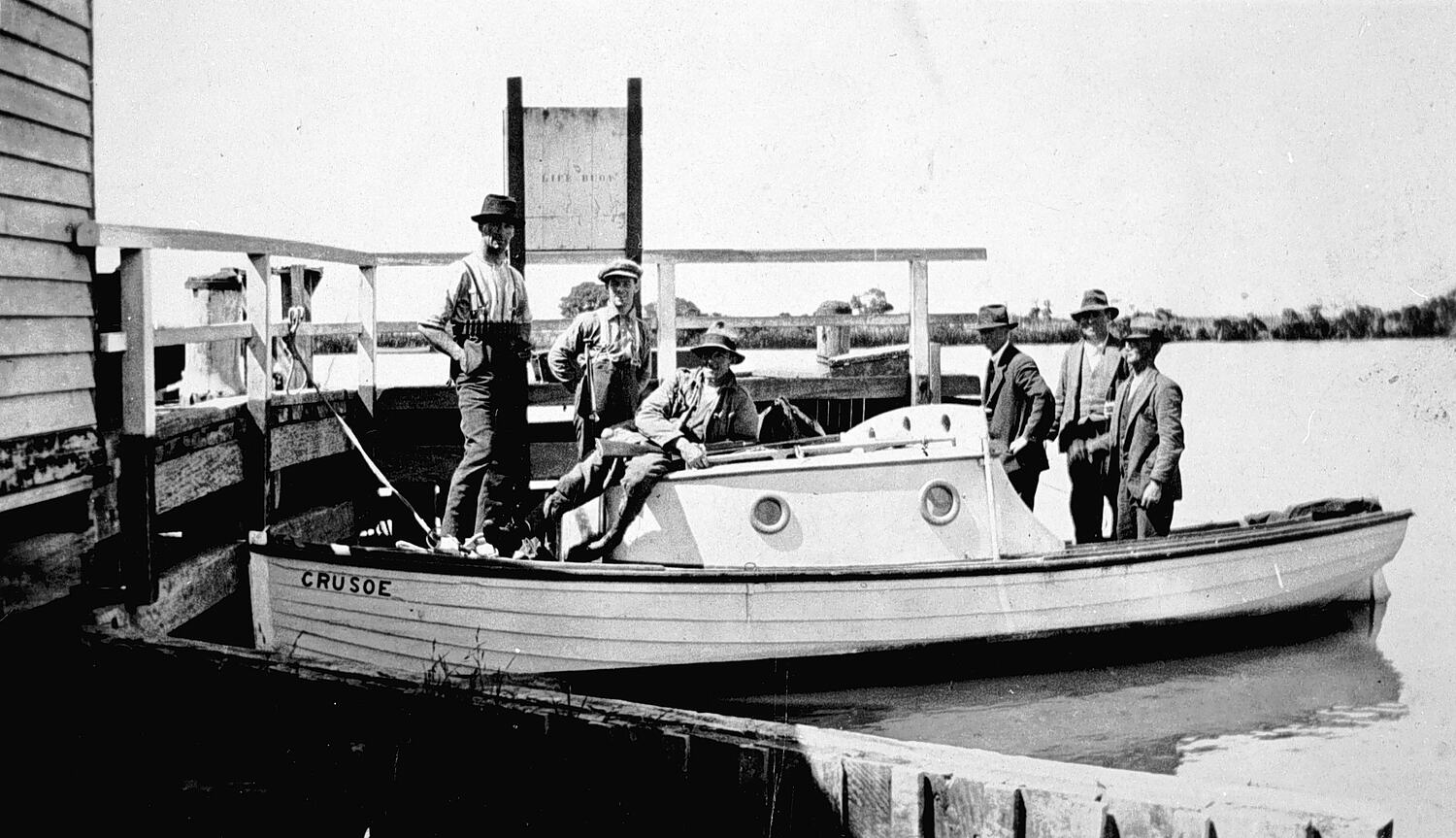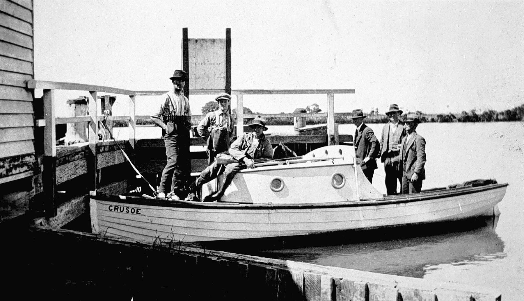 A group of men on a boat, the 'Crusoe', which is tied up at a pier.