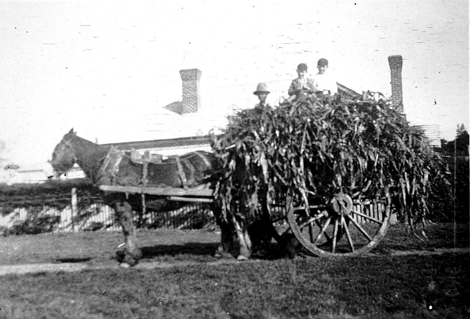A man and two small boys with a wagon load of maize. There is a house behind them.