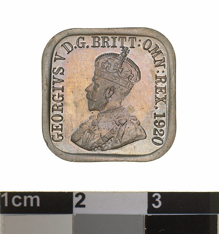 Between 1919 and 1921 a series of experiments were undertaken for a square coinage in nickel to replace the large bronze penny and halfpenny coins. The shape and size was based of a coin from Ceylon (Sri Lanka). These patterns were never authorised for issue.