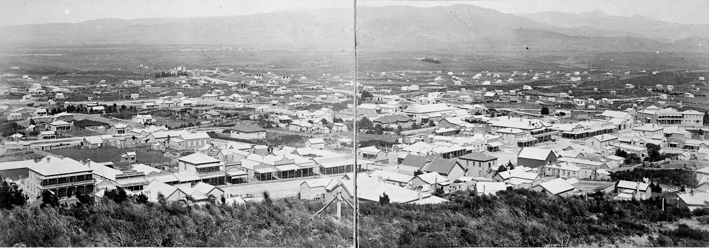 Black and white negative of a Township in New Zealand, circa 1905. In the image a building for J. Hague-Smith & Company, Ironmongers can be seen. First established in Grahamstown, Thames about 1875. By 1915 it had branches in Waihi, Paeroa, Netherton and Shortland.