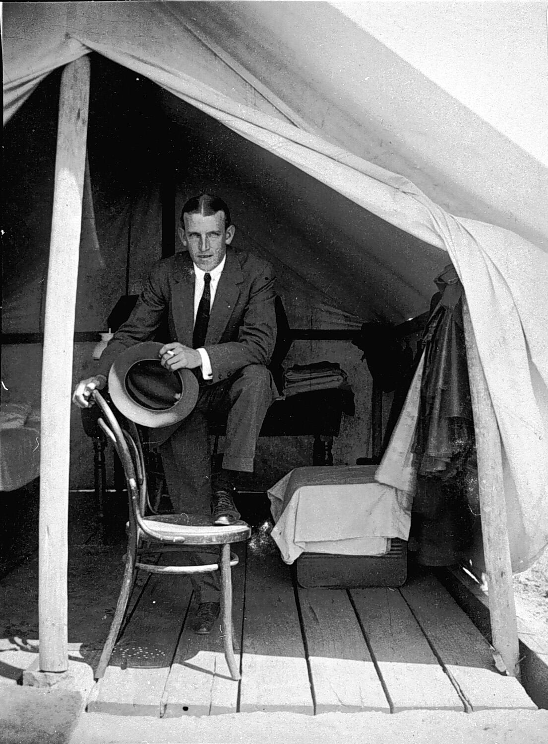 A man inside a tent. He is wearing a suit, carries a hat and stands with one foot on a chair.