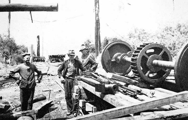 Workers at a sawmill with a piece of machinery.