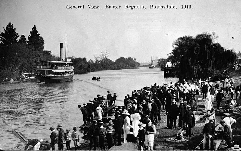 Steamboats and small boats on the Mitchell River at the Easter Regatta. The steamboat in the foreground is the SS Gippsland.