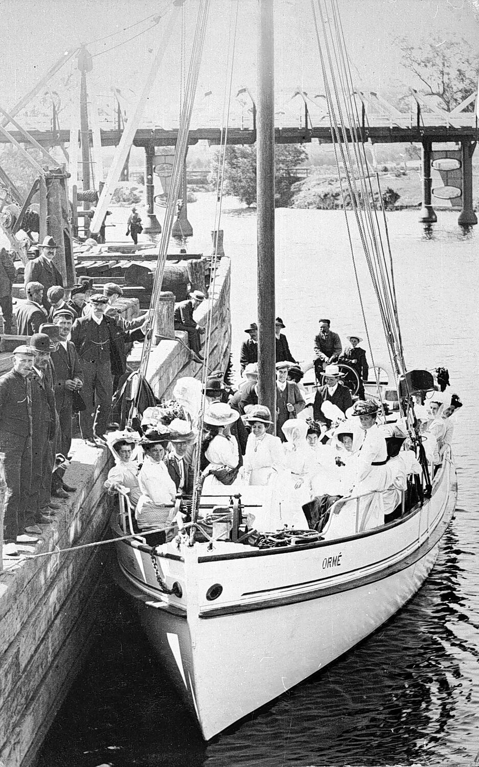 The auxiliary fishing ketch 'Orme' tied up at a pier on the Mitchell River at Bairnsdale, Gippland. The passengers are mostly female while a number of men stand on the pier. There is a bridge in the background. In June 1909 the 'Orme' disappeared during a voyage from Cunninghame to Mallacoota with six men onboard. Despite an extensive search, no trace of the vessel or crew was found at the time. The wreck was eventually found washed ashore at Cape Conran in October 1913. Henry Lawson referred to the loss of the Orme in his 1910 poem 'Mallacoota Bar'.
