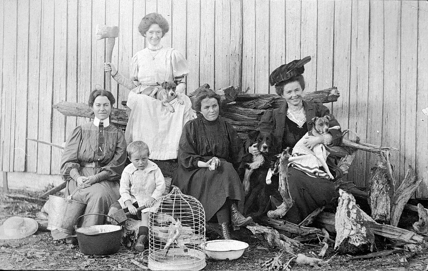 Four women and a small boy seated on a pile of logs. Two women hold dogs, one also holds an axe. The small boy holds a toy spade and a further woman a bucket. There is a cockatoo in a cage in front of the group.