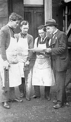 Builders consulting a plan. One man holds a saw and another a spirit level.