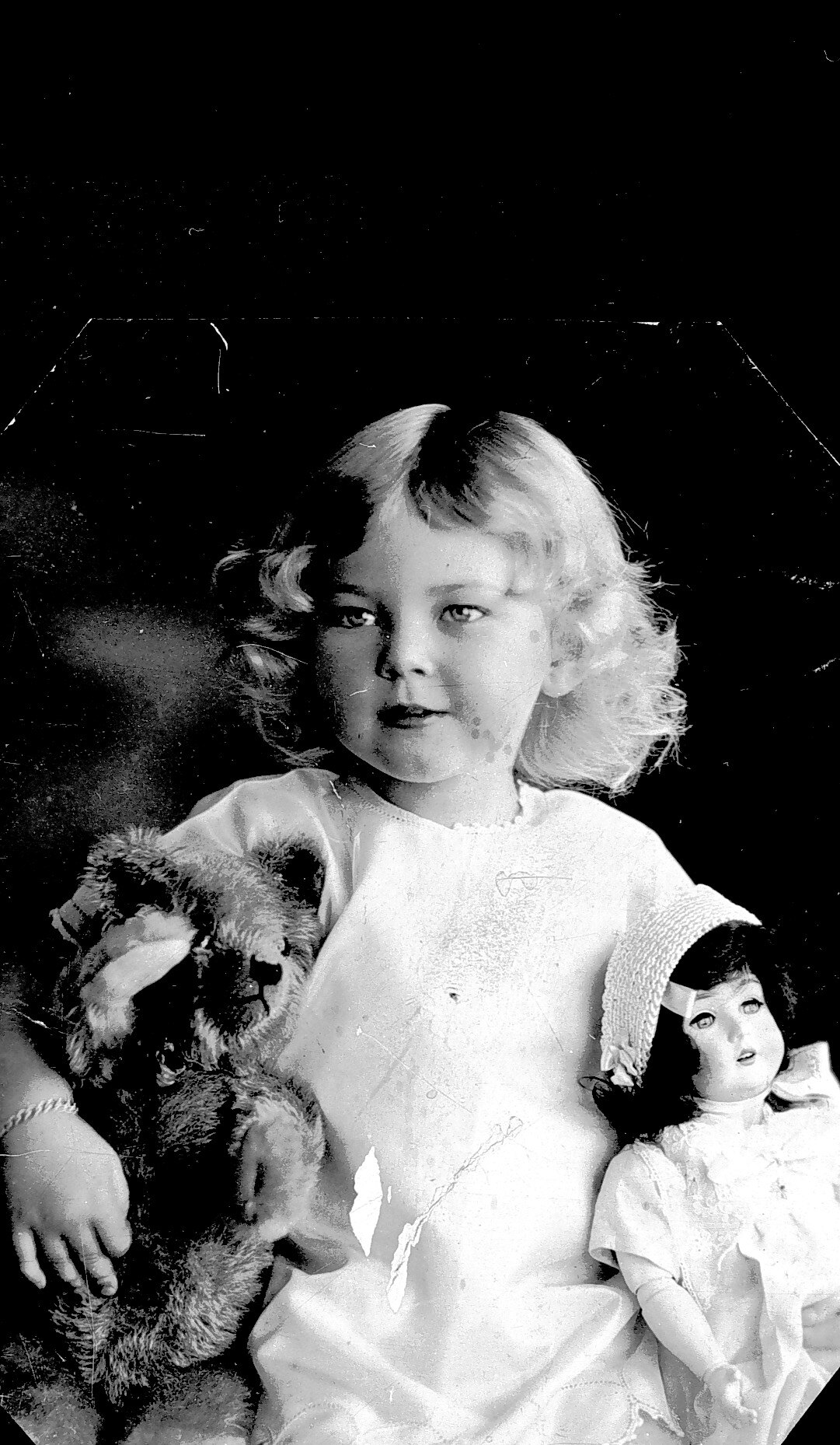 A studio portrait of a small girl holding a doll and a teddy bear.
