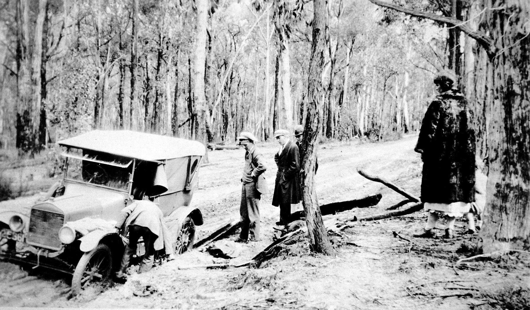 A group of men with a bogged Model T Ford car on a bush road. A woman and a small child stand on the right.
