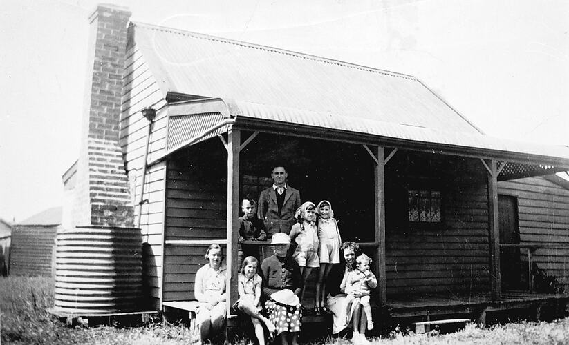 A family group on the verandah of a small wooden house. There is a water tank on the left.