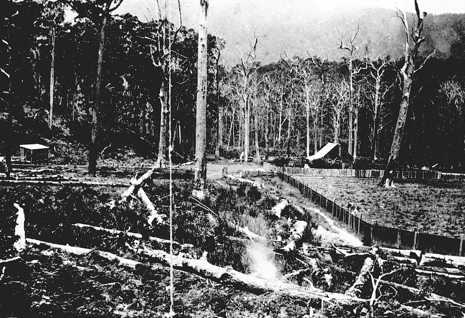 Helmer 's farm. There is an enclosed paddock on the left with the farmhouse behind. On the left there is felled timber.