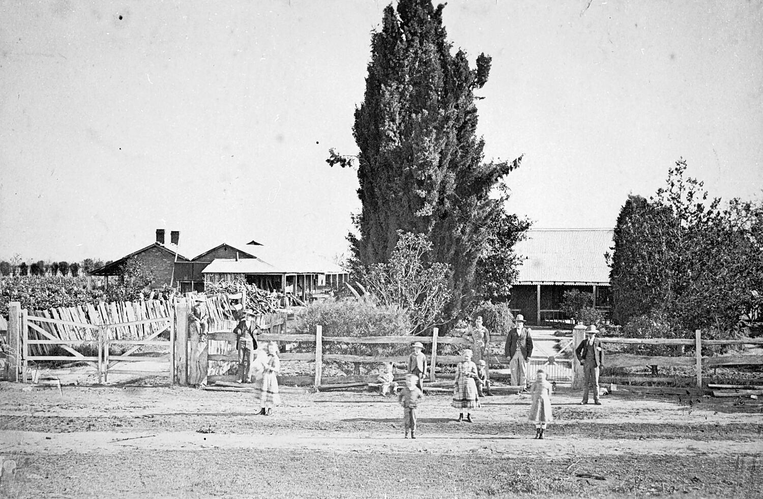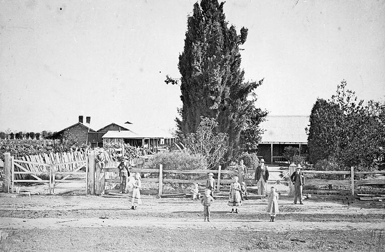 Family group in front of house and garden at the 'Eclat' vineyard. Vines and outbuildings in the background. The house garden is fenced with post and rail.