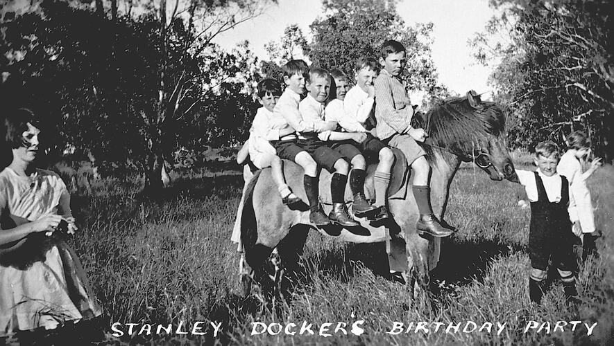 Printed in white ink, across bottom of photograph: "STANLEY DOCKER'S BIRTHDAY PARTY"