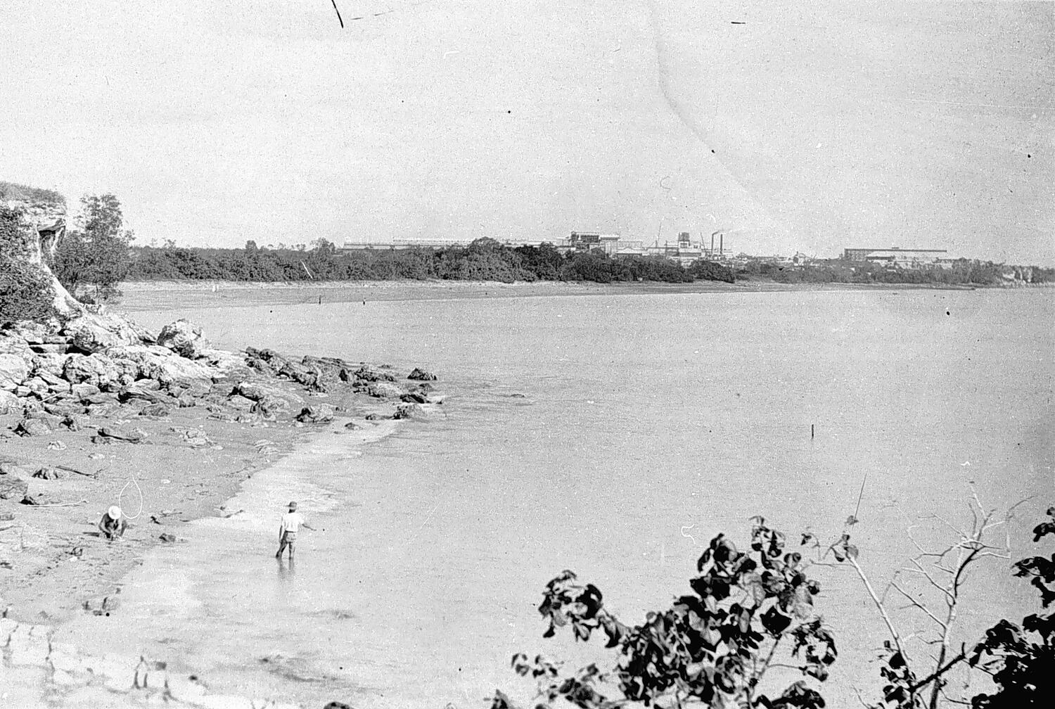 Fannie Bay. There are two men on the left and the meatworks can be seen across the bay.