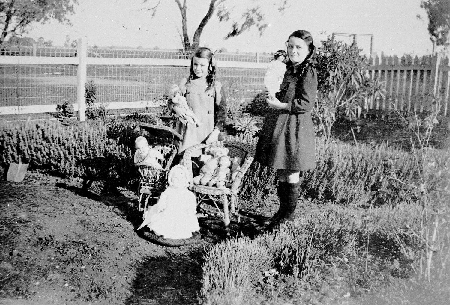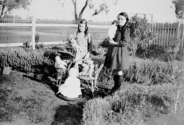 Black and white negative of Phyllis and Alma McDonald with their dolls in the garden of a house, Dockers Plains, Victoria, circa 1925.