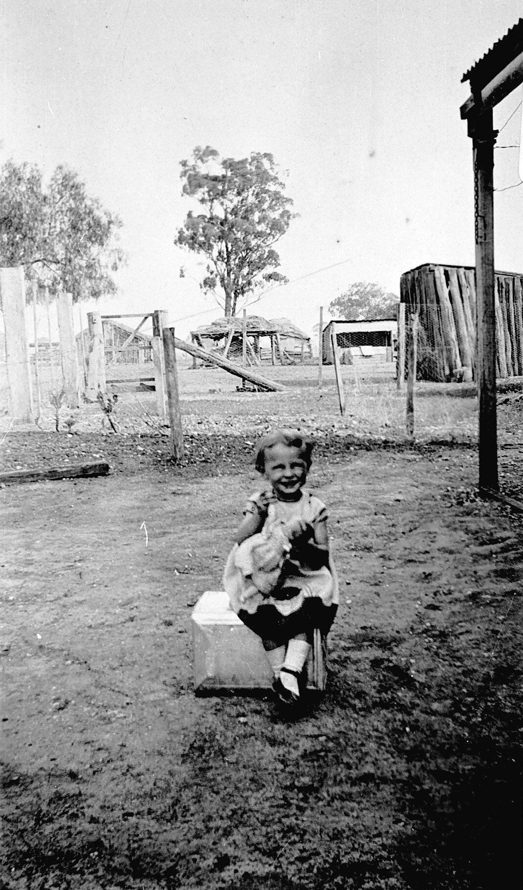 A young girl sitting on a kerosene tin in a farmyard. She is holding a doll.