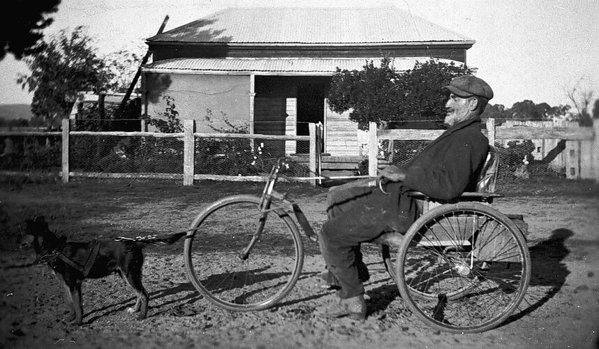 A dog pulling a man in a tricycle wheel chair on 'Wyadra' farm.