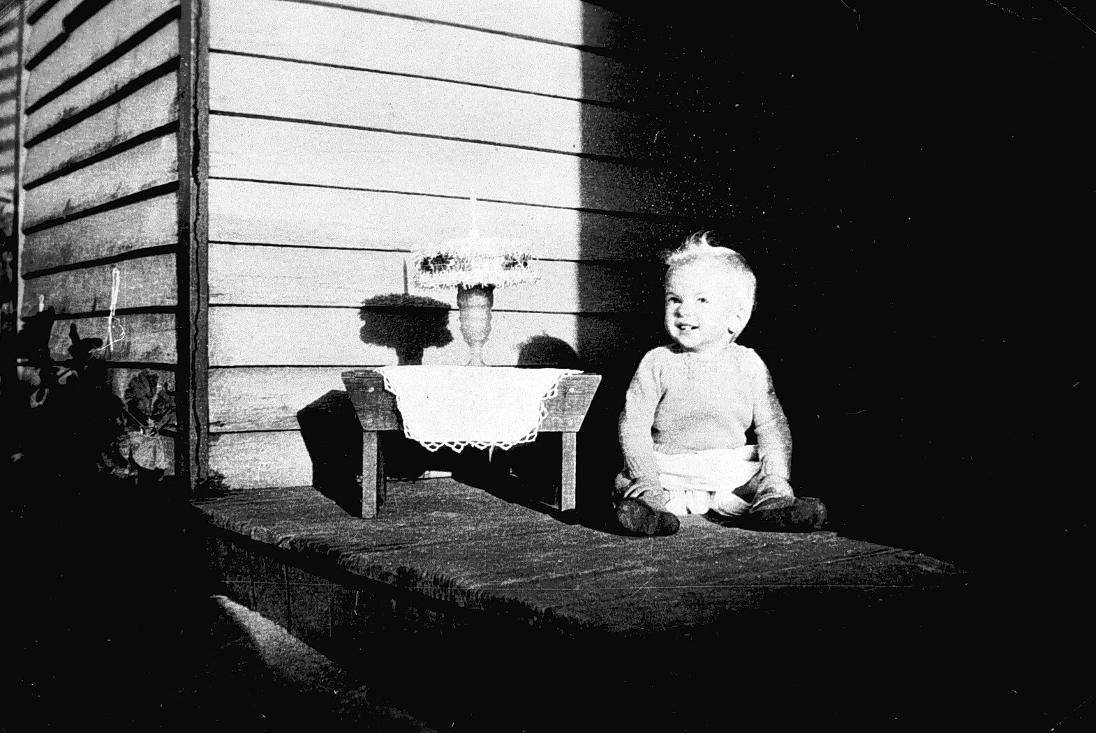 A small girl at her first birthday party. There is a cake with a single candle on a table beside her.