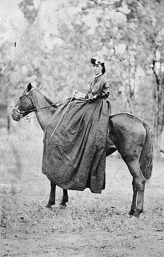 A woman riding a horse sidesaddle. She is wearing a very long riding habit.
