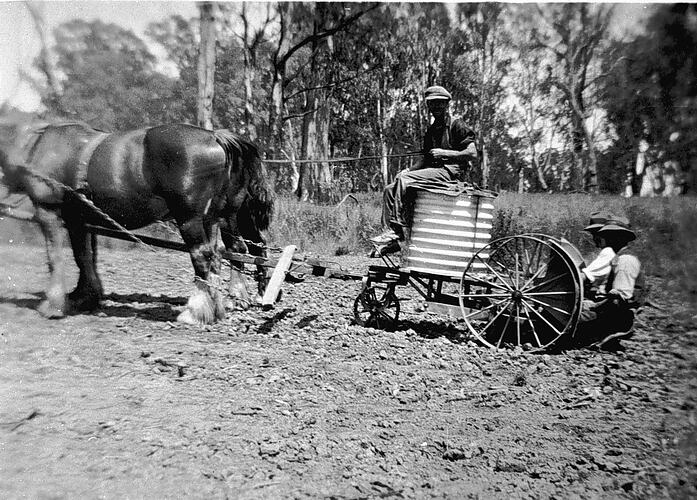 Men planting potatoes on 'Wyadra' farm. The man driving the team is sitting on a tank on a cart, the other two men are seated behind the cart.
