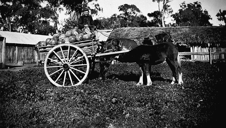 A man seated on a horsedrawn spring cart or dray loaded with water melons. There is a foal in the foreground drinking milk from the mare draughthorse harnessed up to the cart. On the side panel of the cart is painted the words: "MORRISON, ??? WORTH, ???TION".