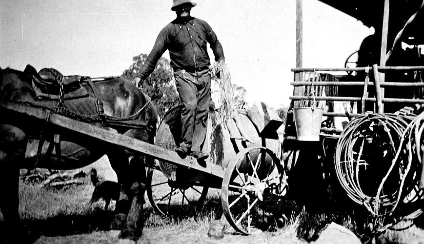 A horse-drawn 'Furphy' water cart is standing beside the rear of a steam traction engine. Les Morrison, is standing on the horse-shaft of the water cart leaning on the horse's hind-quarters with his right hand, while in his left hand he holds a bundle of what appear to be twine ties - possibly for tying sheaves of oats. There is a dog standing in the shade behind the horse and gum trees in the background.