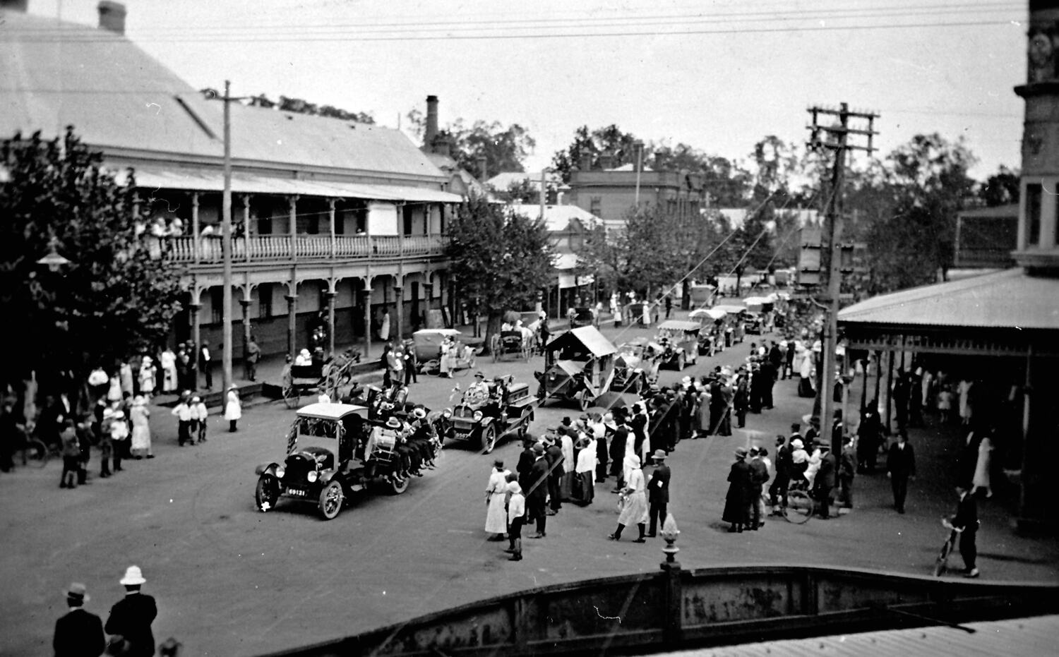 A parade of motor vehicles through the streets of Wangaratta. Truck in the lead is a Model T Ford.