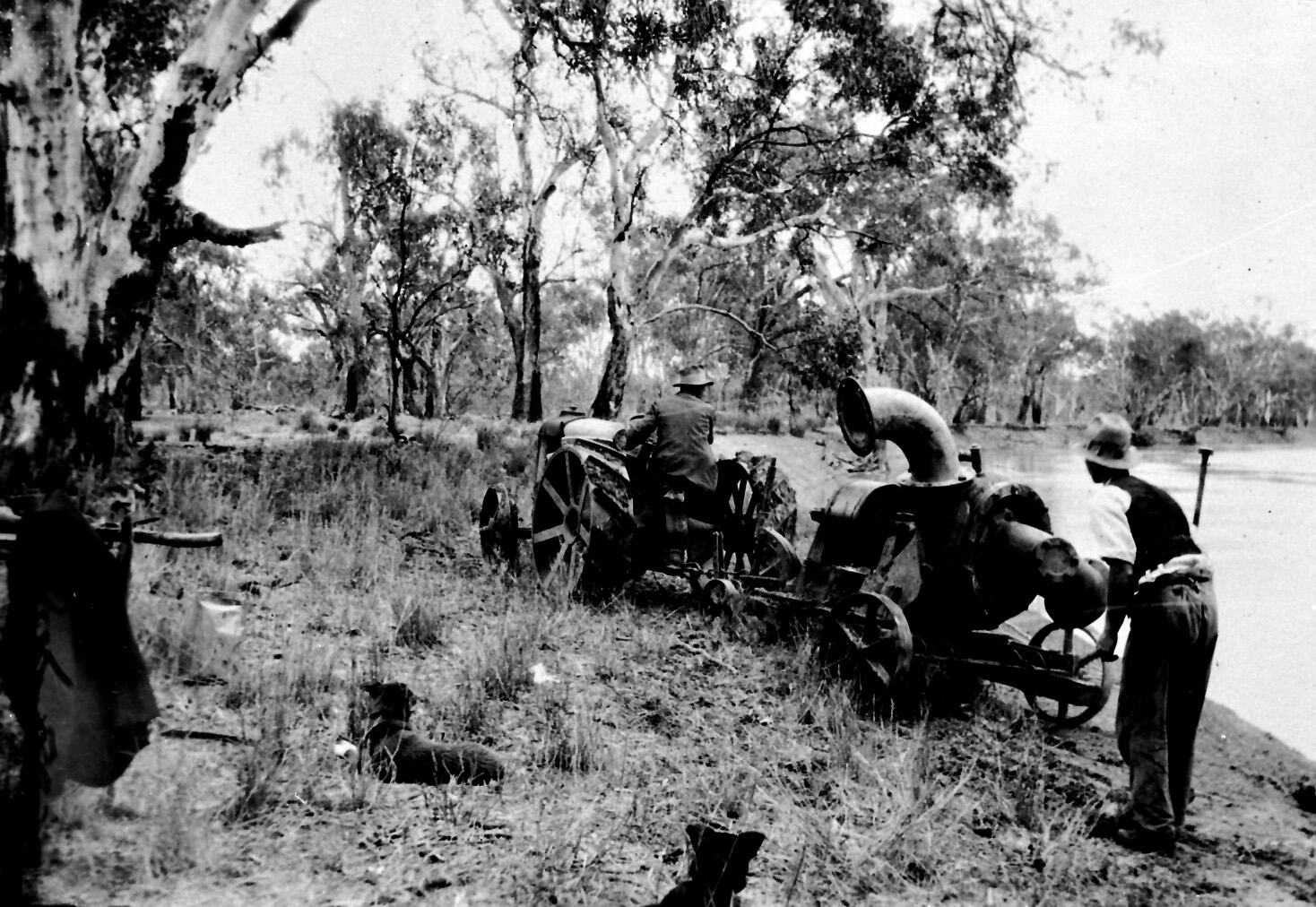 Men installing an irrigation pump. The pump is being drawn by a tractor. The Murrumbidgee river is in the background.