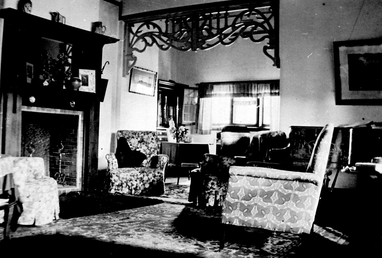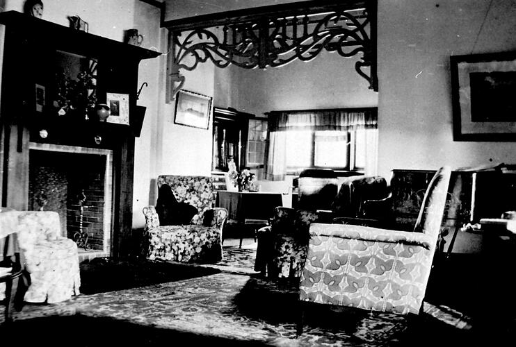 Inside the sitting room on 'Arajoel' station. There is a fireplace on the left.