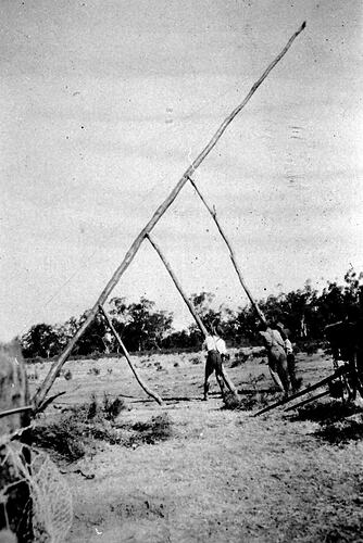 Men erecting a wireless pole on 'Waugorah' station. The pole is now supported by three props and the wagon is parked at the side. (one of a series of images, see also MM 006247, 006249).