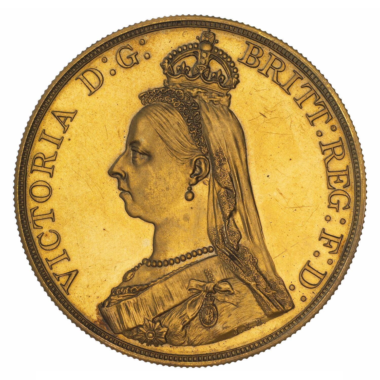Jubilee bust of Queen Victoria wearing imperial crown and facing left, a long veil falls behind the head, the bust is draped and decorated with the Star of the Garter, and also the badge of the Imperial Order of the Crown of India; around, VICTORIA D:G: BRITT: REG: F:D: , the artist's initials J.E.B. below the shoulder.