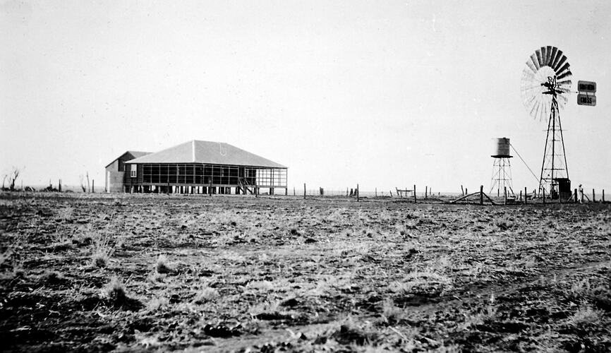 The farmhouse on 'Minerva' farm. There is a water tank and a windmill on the right.