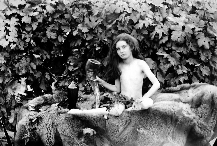 A young girl on a sheepskin rug and holding a bull 's horn. She is wearing only a 'loin cloth' of leaves. The photograph was taken on'kerri kerri' farm.