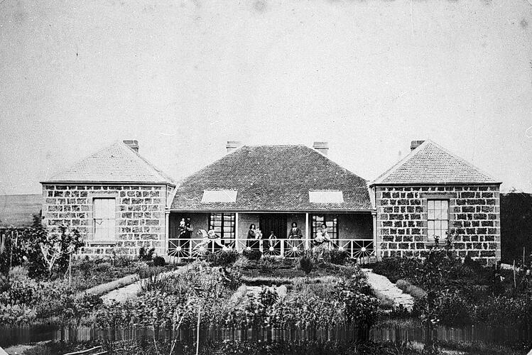 Family on the verandah of the first homestead on 'Terrinallum' station. The house is an unusual design and appears to have two later extensions at either end of the original house. There is a small formal garden at the front with a damn or pond.