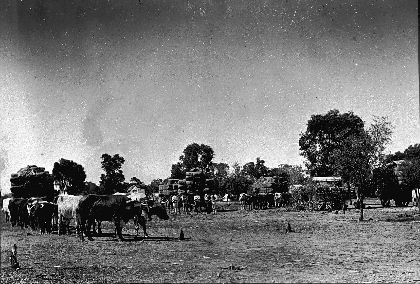 Bullock teams pulling wagon loads of wool bales on 'Weilmoringle' station.