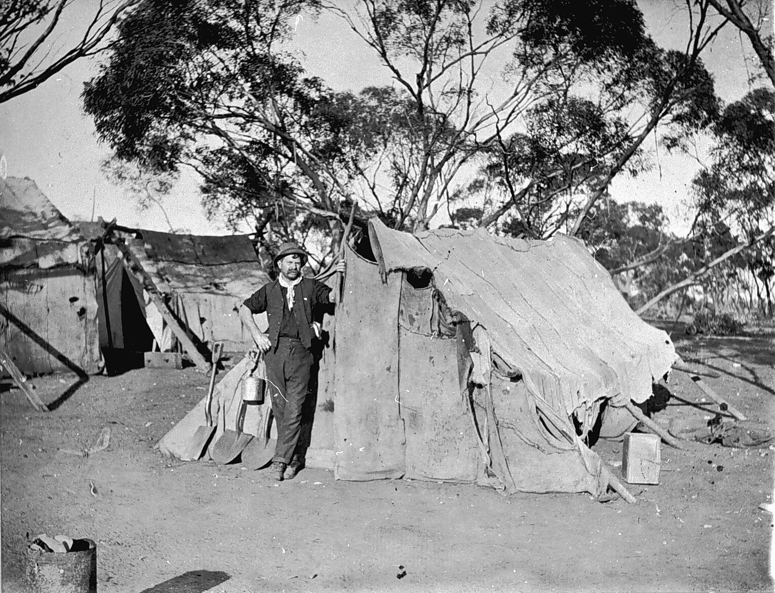 A man in front of a tent constructed of hessian. There are similar huts behind him. A spade, two shovels and a billy can are propped against the tent.