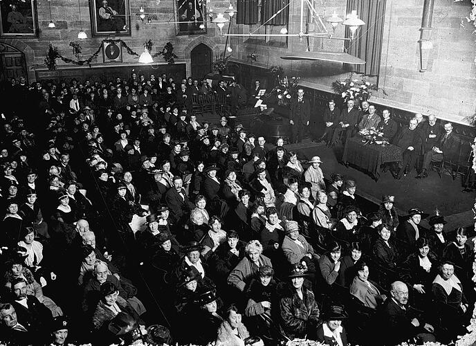 A large group in a hall. This may be a meeting of the Australian Natives Association.