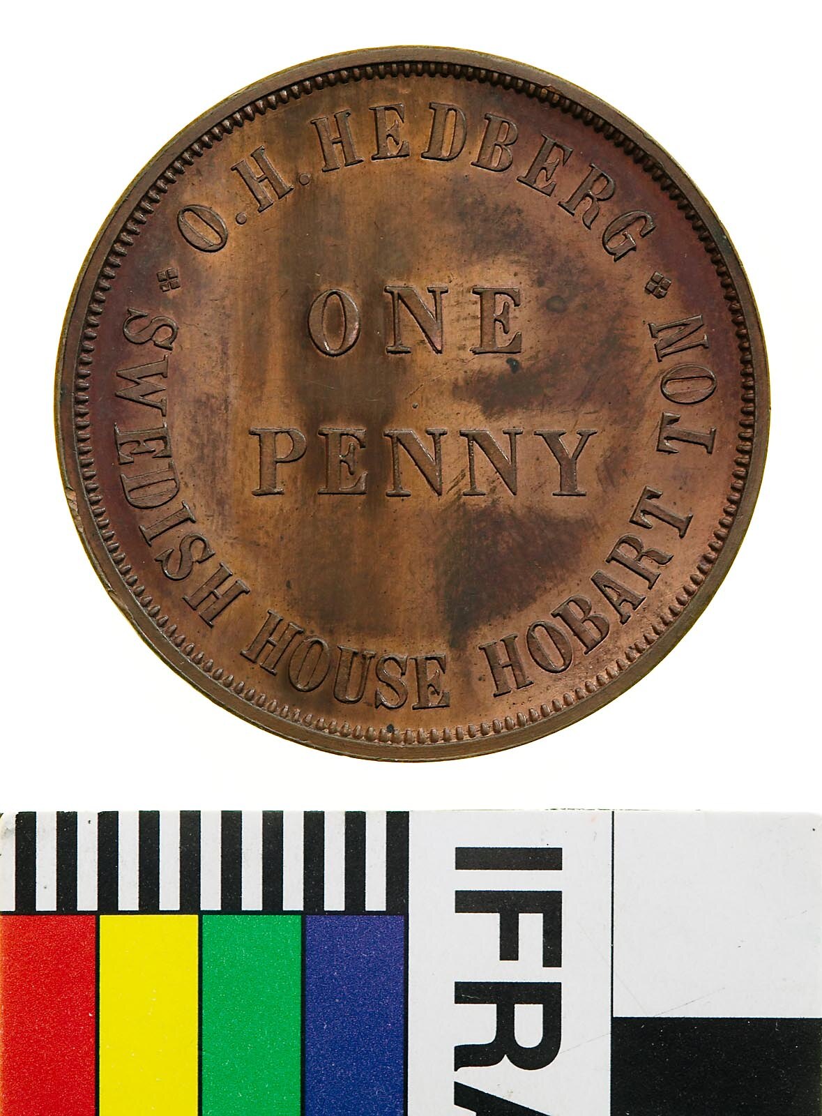 Obverse: O.H. HEDBERG SWEDISH HOUSE HOBART TON ONE PENNY Reverse: AUSTRALIA W.J. TAYLOR LONDON