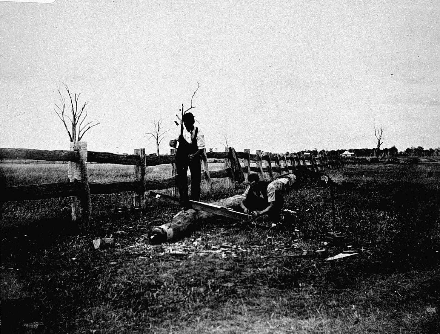 Two men constructing a power pole.