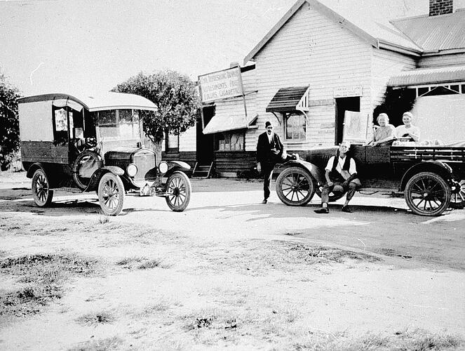 Four people with a Model T Ford van and an open truck in front of a country store.