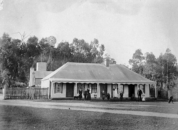 A large family group in front of their rural home. Outbuildings and a wind mill in the background. The house is unusual and could be three small houses each with a window on either side of a door built adjacent. Decorative timber fretwork along the verandah.