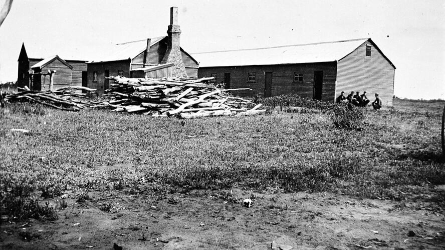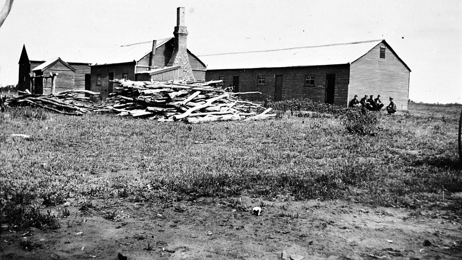 The shearing shed on 'Paika' station. There is a stack of firewood in the foreground and a group of men are seated on the right.