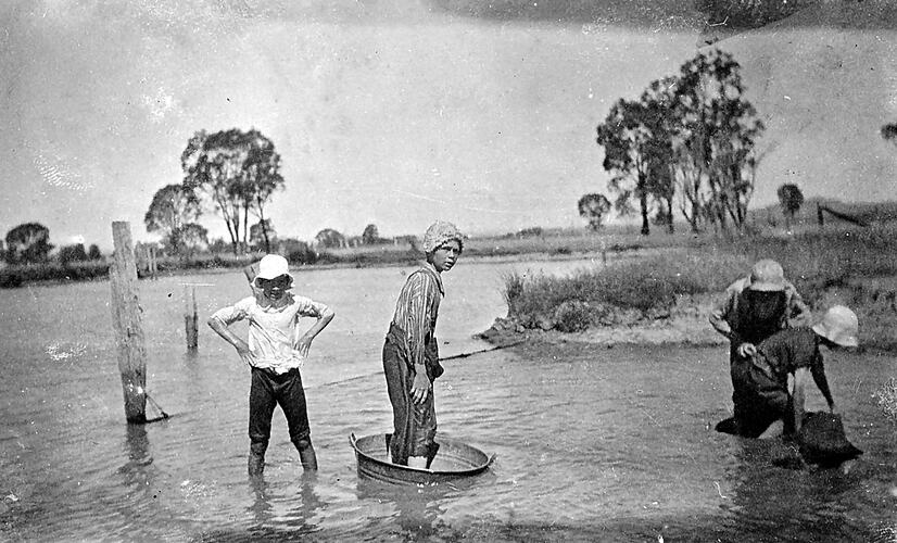 Four boys playing in a creek, one is standing in a wash tub.
