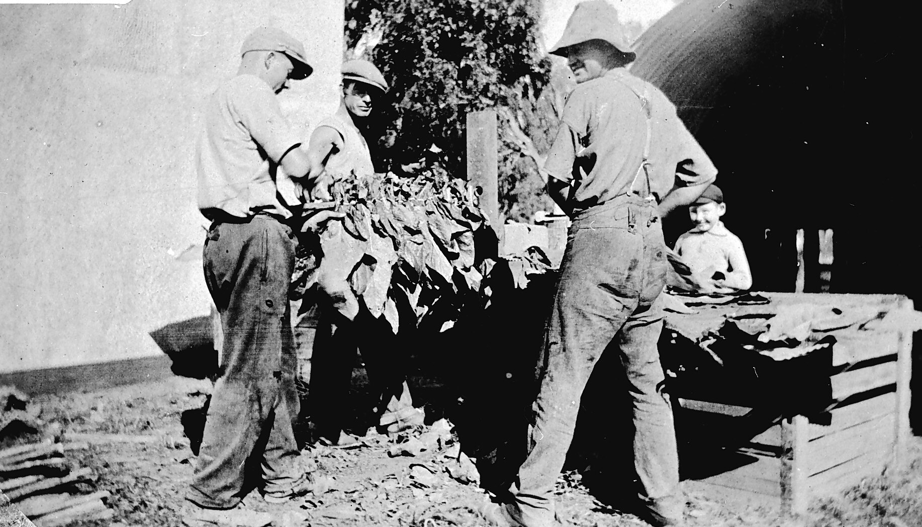 Three men and a young boy with a tobacco crop on 'Murray Park' station.