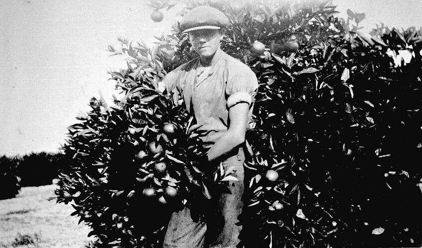 A man displaying the first crop of oranges on the block at 'Murray Park' station.