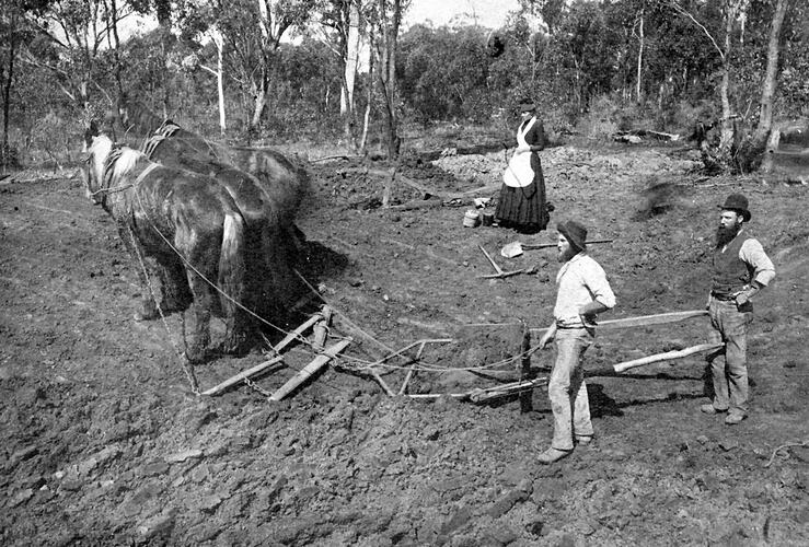 Two men using a horse-drawn scoop to dig a dam. A woman watches in the background.