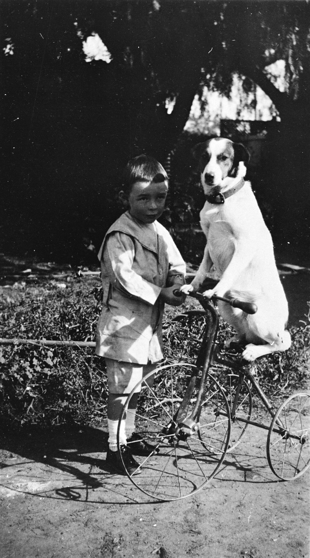 A small boy with a dog which is perched on a tricycle. The dog 's name was'Spot'.
