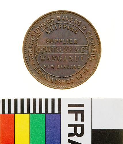 Bronze Halfpenny Token, minted by Todman, London. Issued by J. Hurley & Co, Wanganui, circa 1875. John Hurley migrated to New Zealand with his parents and siblings in 1842, at the age of 12. They settled in Wellington where his father, Alexander, ran a bakery on Lambton Quay. In 1853 John moved to Wanganui and opened his own bakery. His range of goods included bread, biscuits, confectionery and groceries; he also supplied ships. He married a local woman, Lorenna Cunnabel, on January 24, 1855 at Brunswick Station, a few miles from the town. They had four children. Hurley sold his business on the 8th of January 1857 to a wealthy local man, Mr Joseph Augustus Burnett. However in 1864 he bought it back. The same year Hurley's brother Henry arrived in Wanganui. An almanac advertisement from 1878 showed how John Hurley's business had expanded. As well as bread, biscuits and confectionery, he also listed wholesale and retail grocery and emphasised his ability to create wedding cakes. Hurley later built a much more substantial bakery, a two storey, double fronted wooden building with glass across the front.